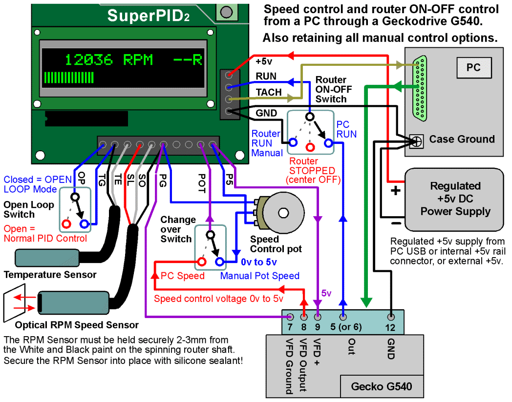 The wiring diagram below shows all possible connections from Super-PID to the Gecko G540. This enables router speed control and router ON/OFF control from PC software, through a Geckodrive G540 (or any other BreakOut Board). The wiring diagram also shows how to retain all the manual/hand control options, and easily switch to PC control when desired.